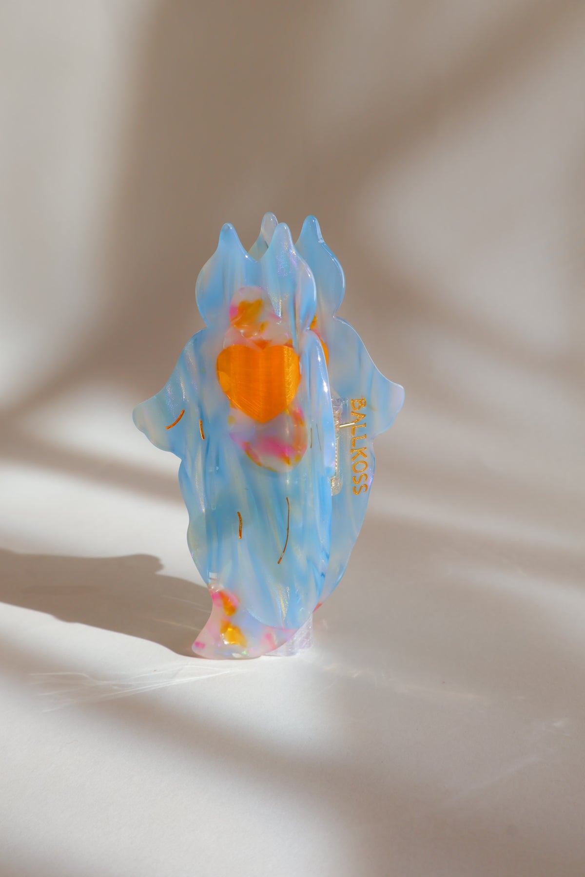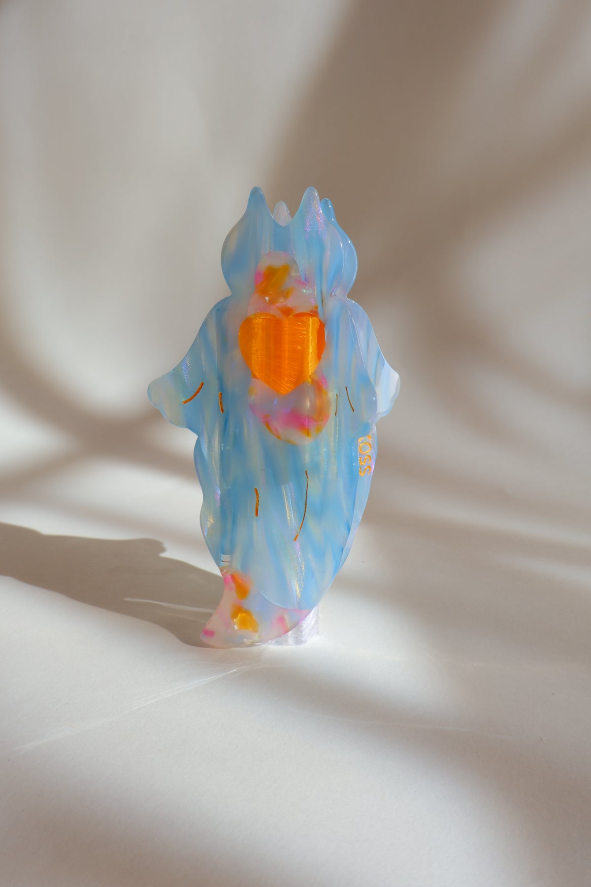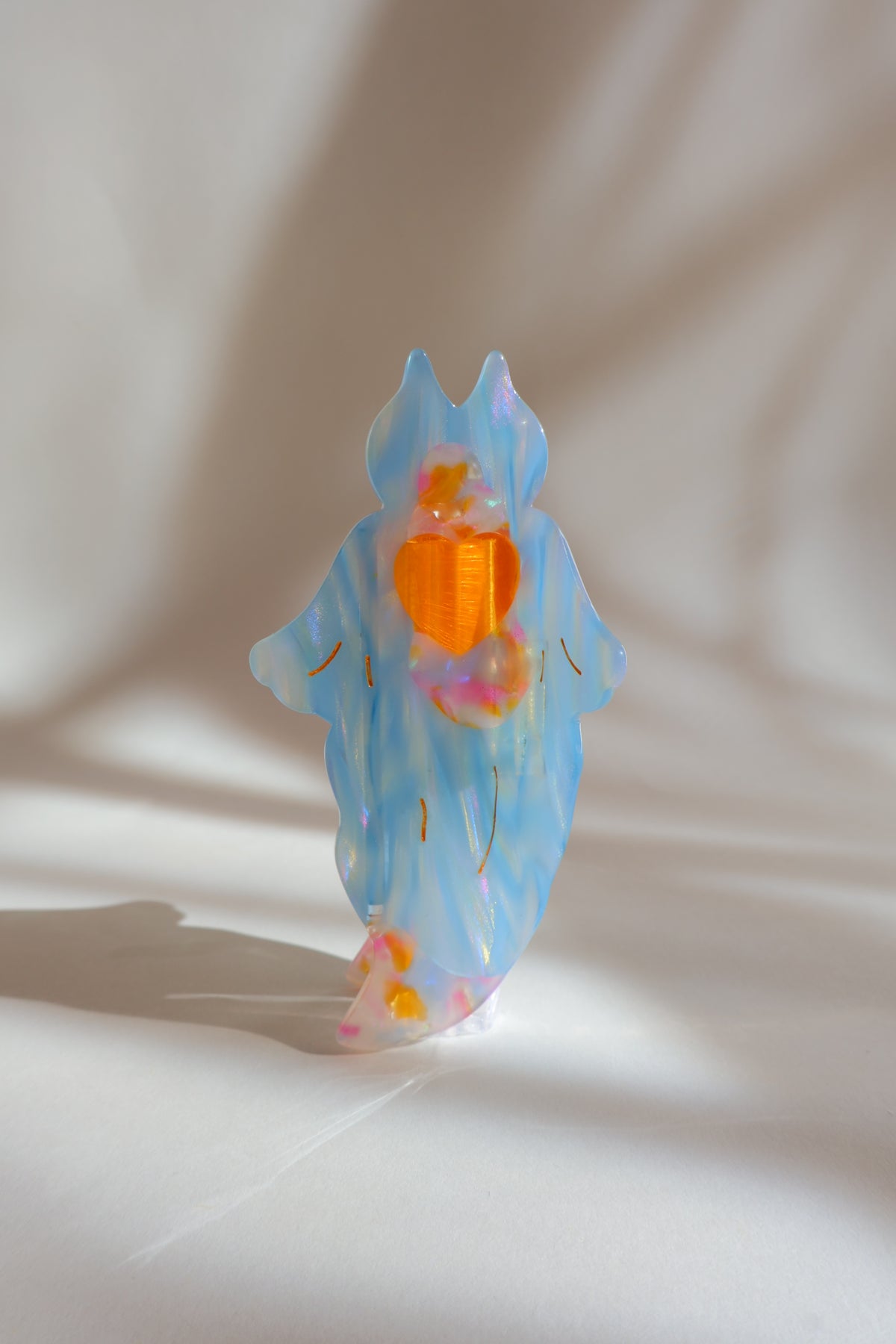 胸元にはオレンジ色のスケルトンハートをあしらい、光を通すことでサンキャッチャーのような透明感を楽しめます。