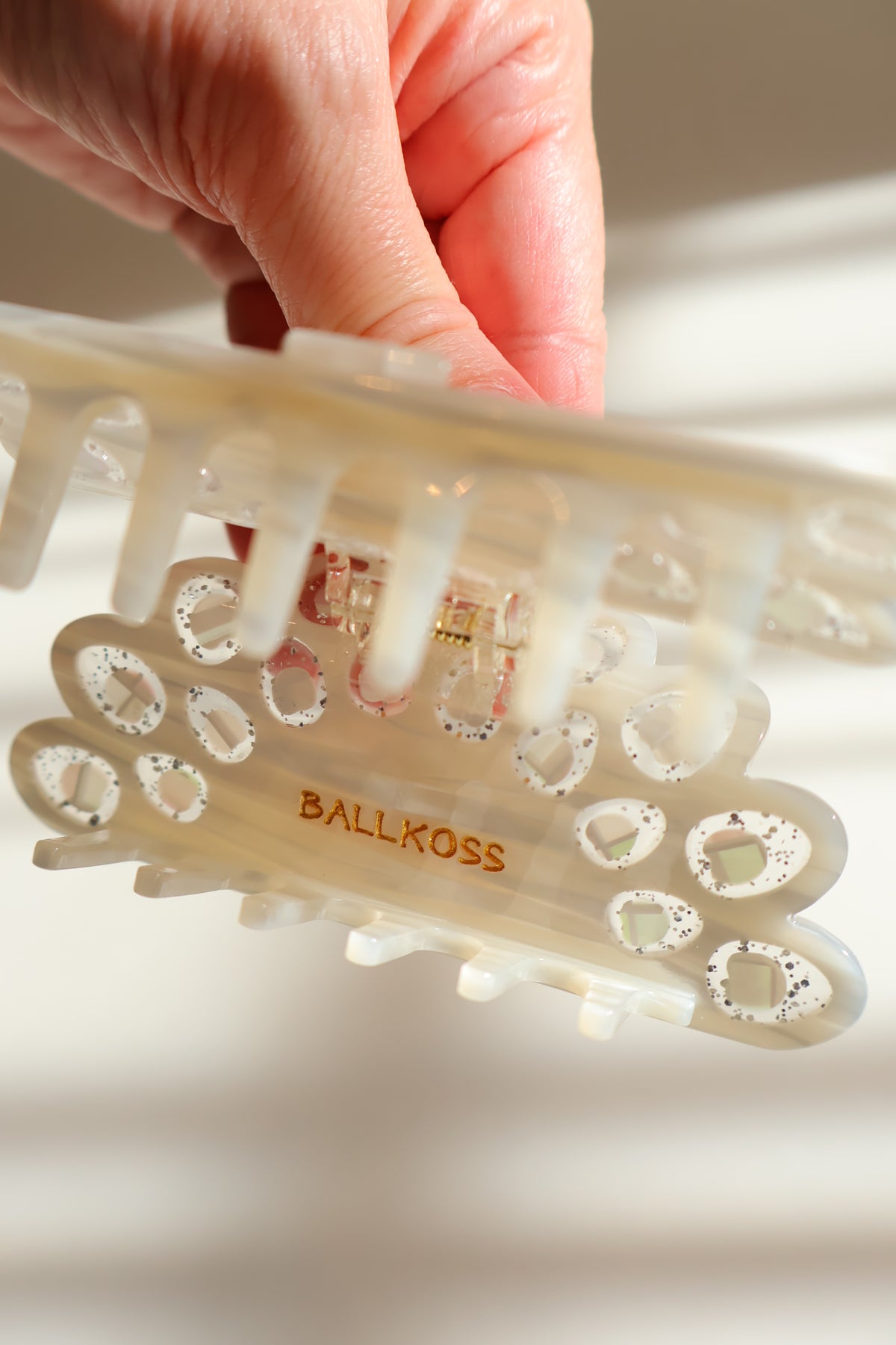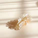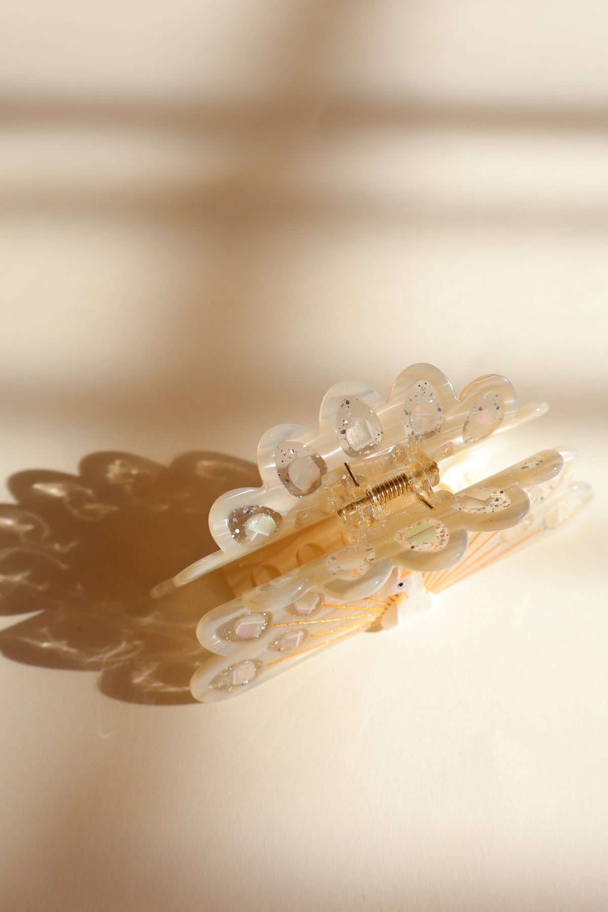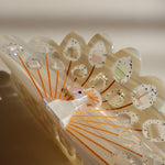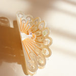 扇状に広がる羽根には、繊細な透明感とさりげないラメが散りばめられ、光を受けるたびにやさしく輝きます。