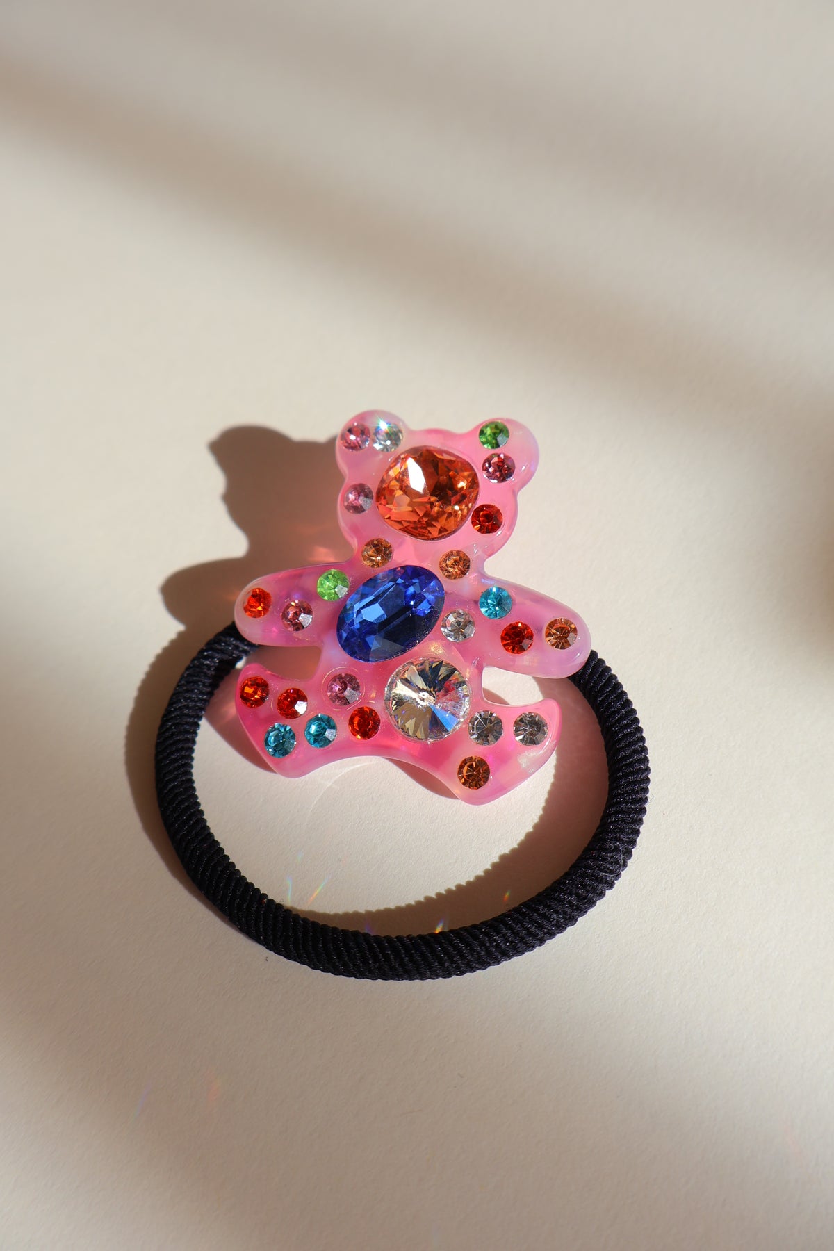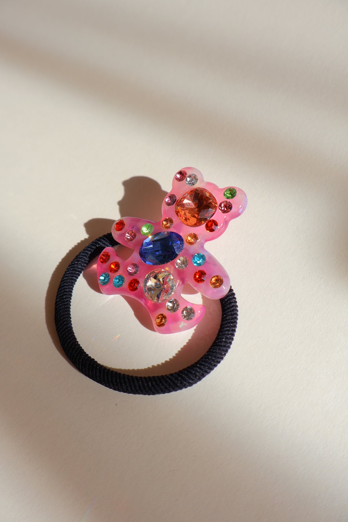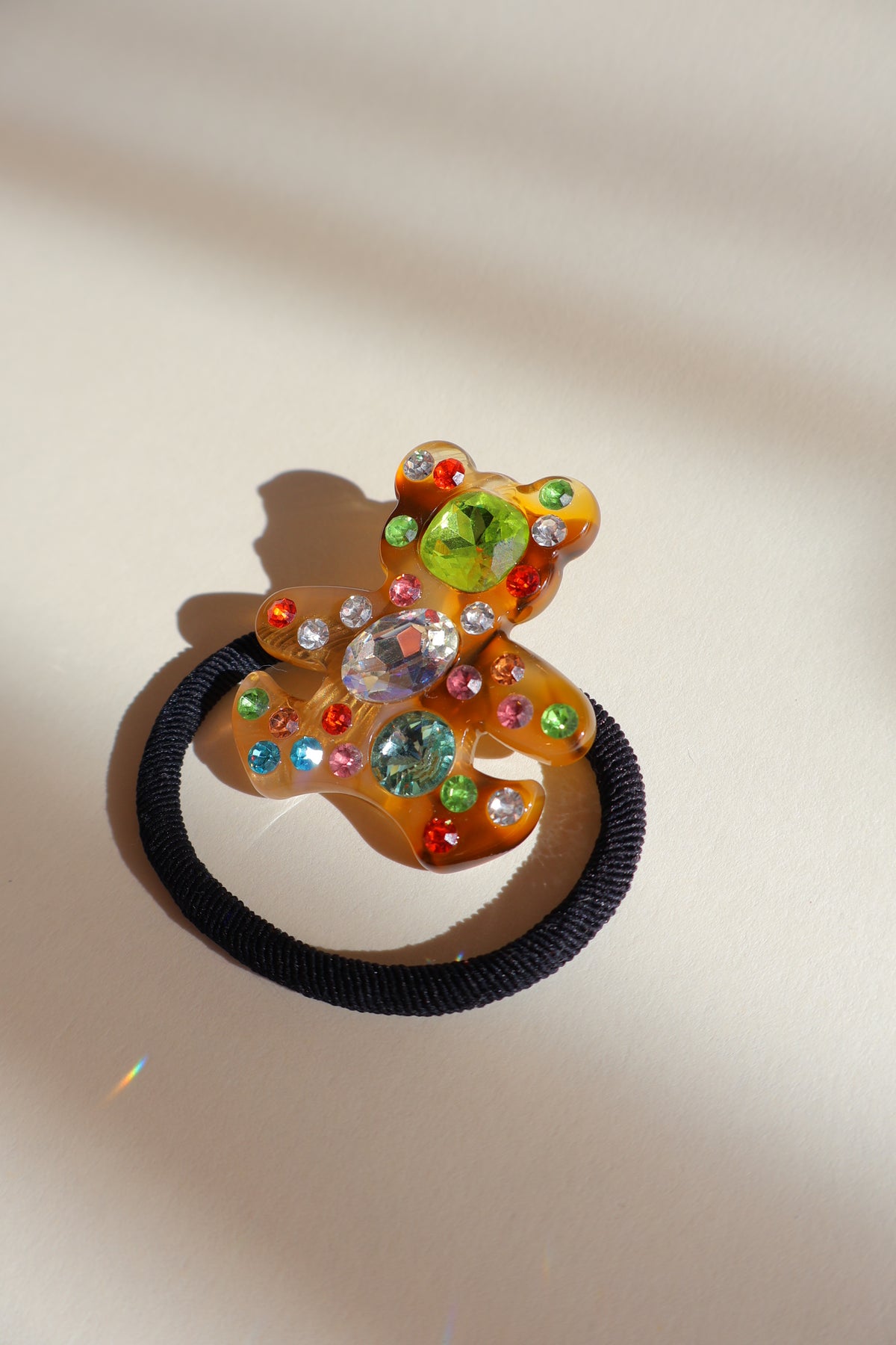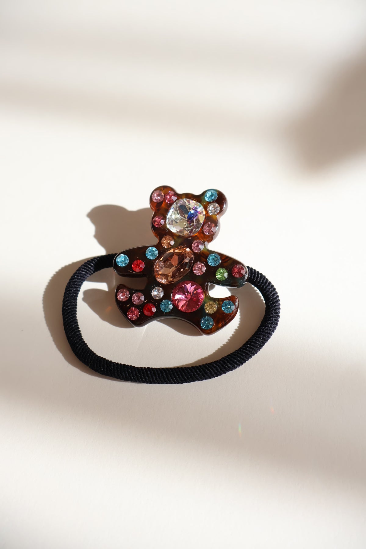 カラフルなクリスタルをたっぷりとあしらった、ジュエリーベアモチーフのヘアゴム。